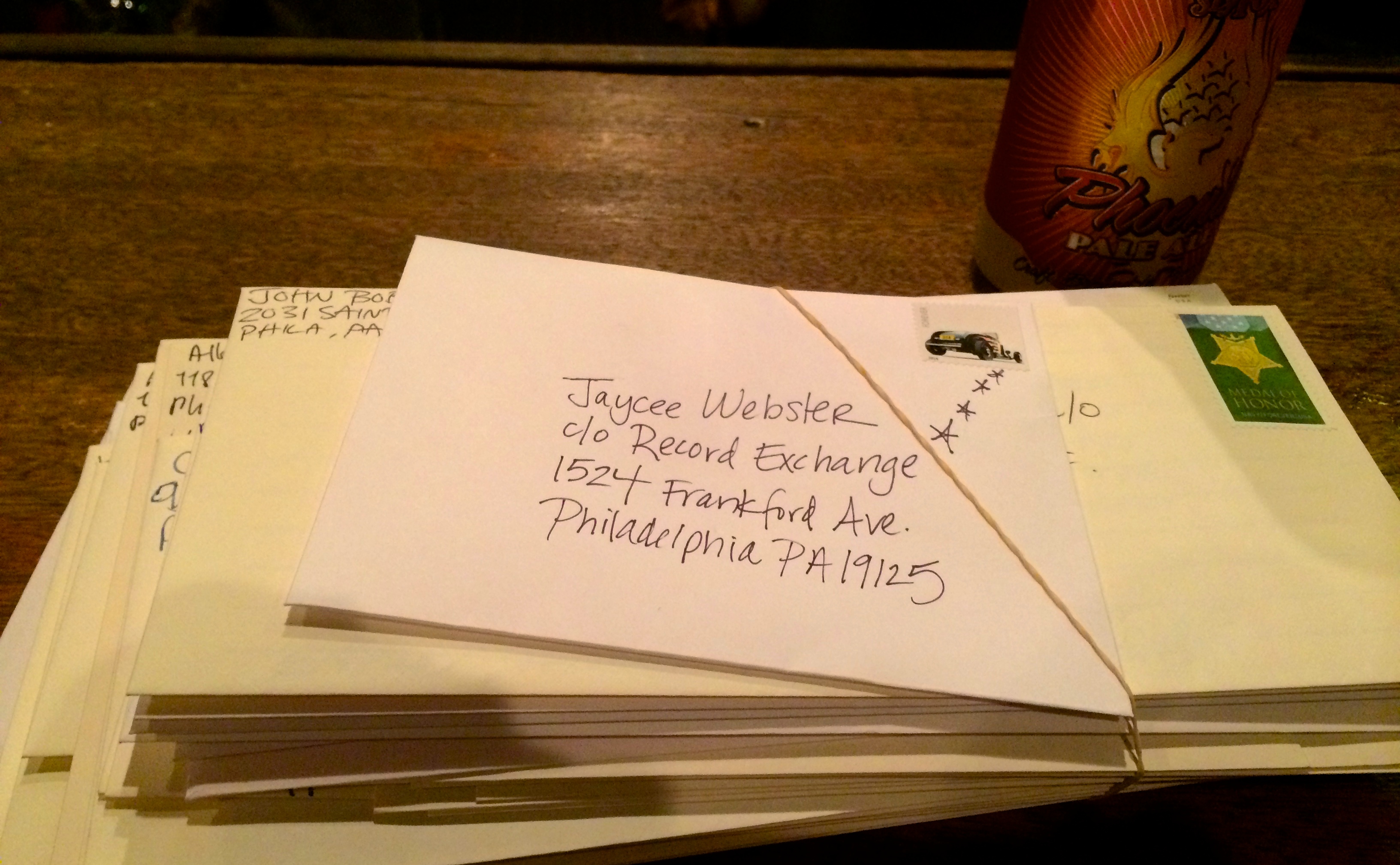 The last session was no exception; we wrote 45 letters to record shop owners and best friends, Tour de France winners and avant-garde composers, sons and daughters, soldiers and civilians. Letters went out as far as Hawaii, Australia, Germany and Vatican City, and others bore addresses just a short walk from our “official” mail box, down the street from Doobies.