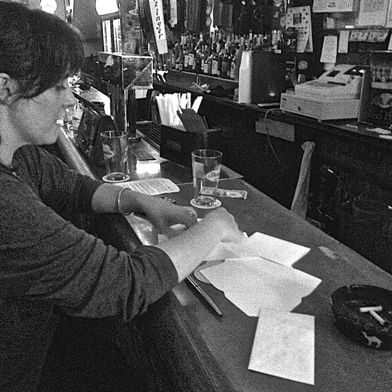 Here’s a moment from last Tuesday’s Publetters at Paddy’s Pub… the real-world equivalent of pressing “SAVE” –when you fold up the page with your words written on it, slide it into the envelope, then seal it shut. Is this series of small tasks superior to the computerized sequence of non-events? I maintain it is, by a mile.